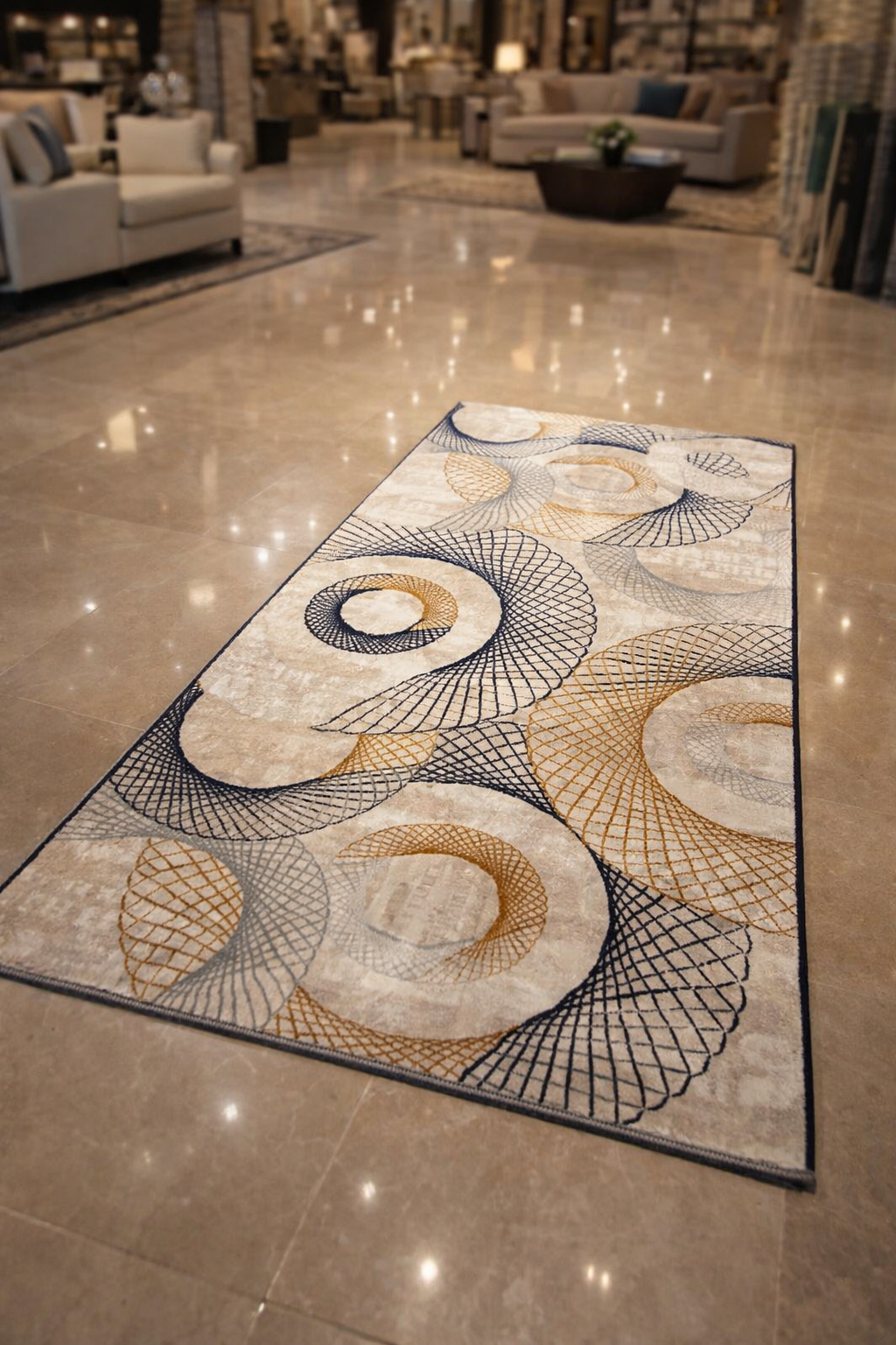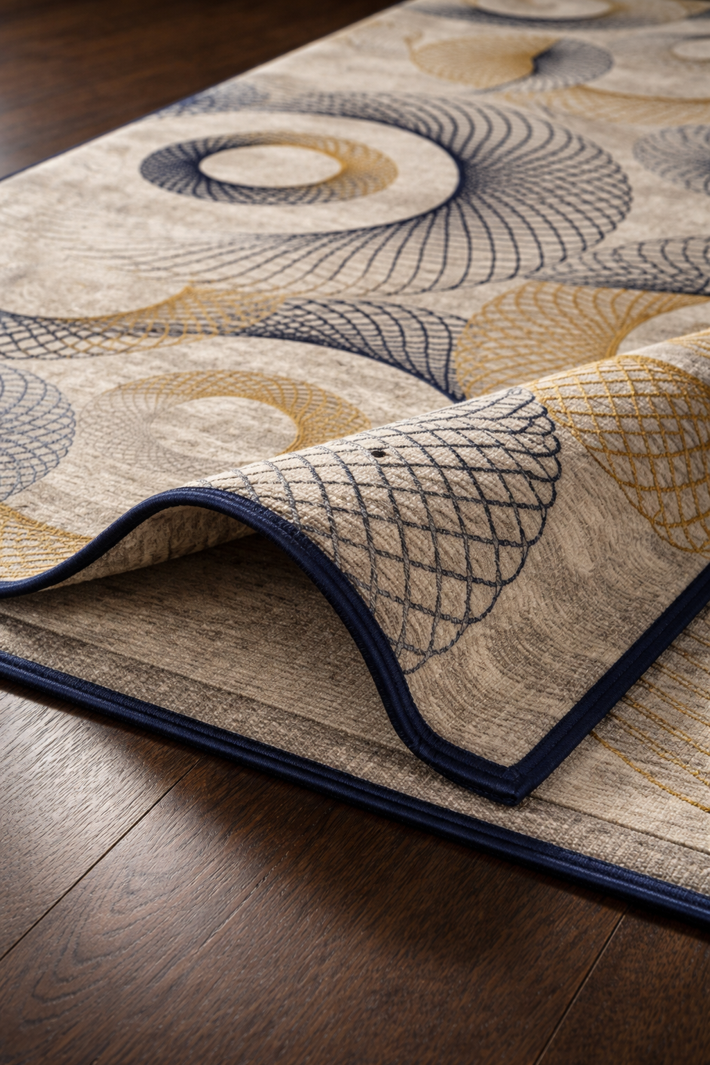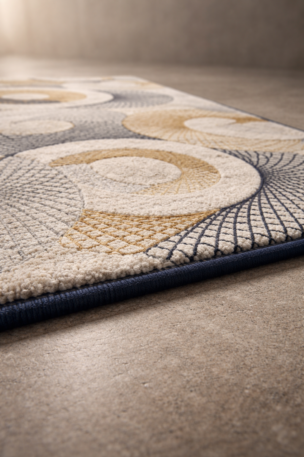 Neutral base with navy and gold accents